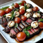 - Top the sliced steak with the Caprese mixture and garnish with fresh basil leaves.