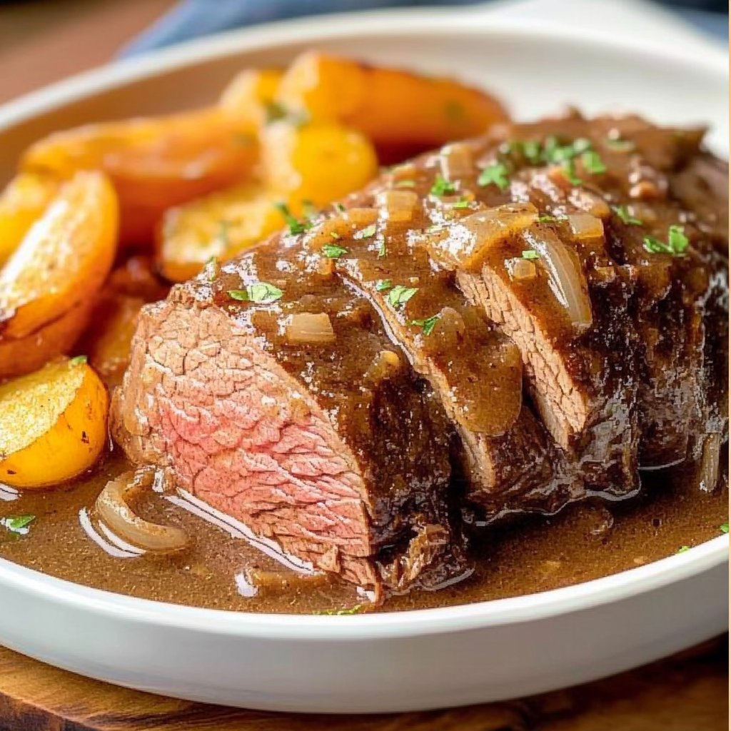 A tender pot roast simmered in a savory gravity made with caramelized onions and garlic, perfect for comforting family dinners.